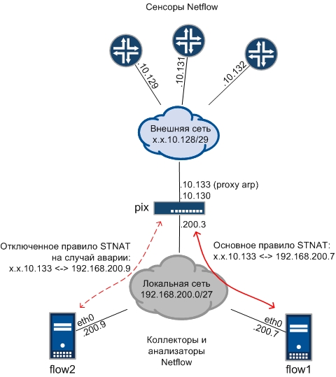 Есть основной “железный” сервер (flow1), с большим объемом дисков, на который пограничные маршрутизаторы отправляют netflow данные. Сервер flow1 стоит в локальной сети за файрволом (pix) в котором сделан статический нат между внутренним и внешним ip адресом.