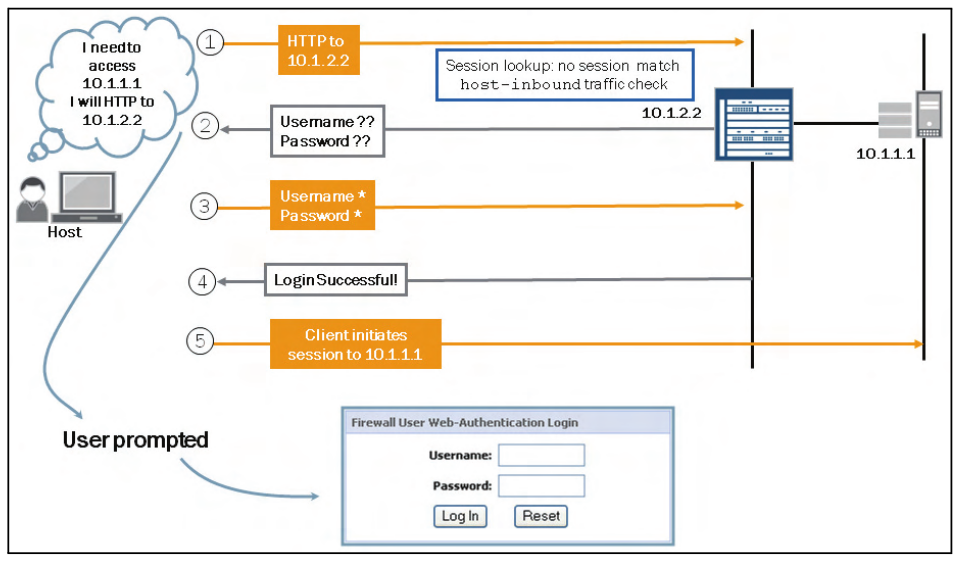 Когда пользователь обращается к telnet, ftp или http ресурсу srx (в случае если удовлетворяются условия политики безопасности) перехватывает сессию и передает пользователю форму для для ввода имени и пароля. Если аутентификация прошла успешно srx разрешает прохождения трафика через политику безопасности, весь последующий трафик с таким же ip адресом источника так же сможет проходить через srx. Если трафик не ходил в течении 10 минут (дефолтное значение) процесс аутентификации надо будет повторить, значение таймаута можно изменить в пределах от 10 минут до 24 часов (1440 мин.).